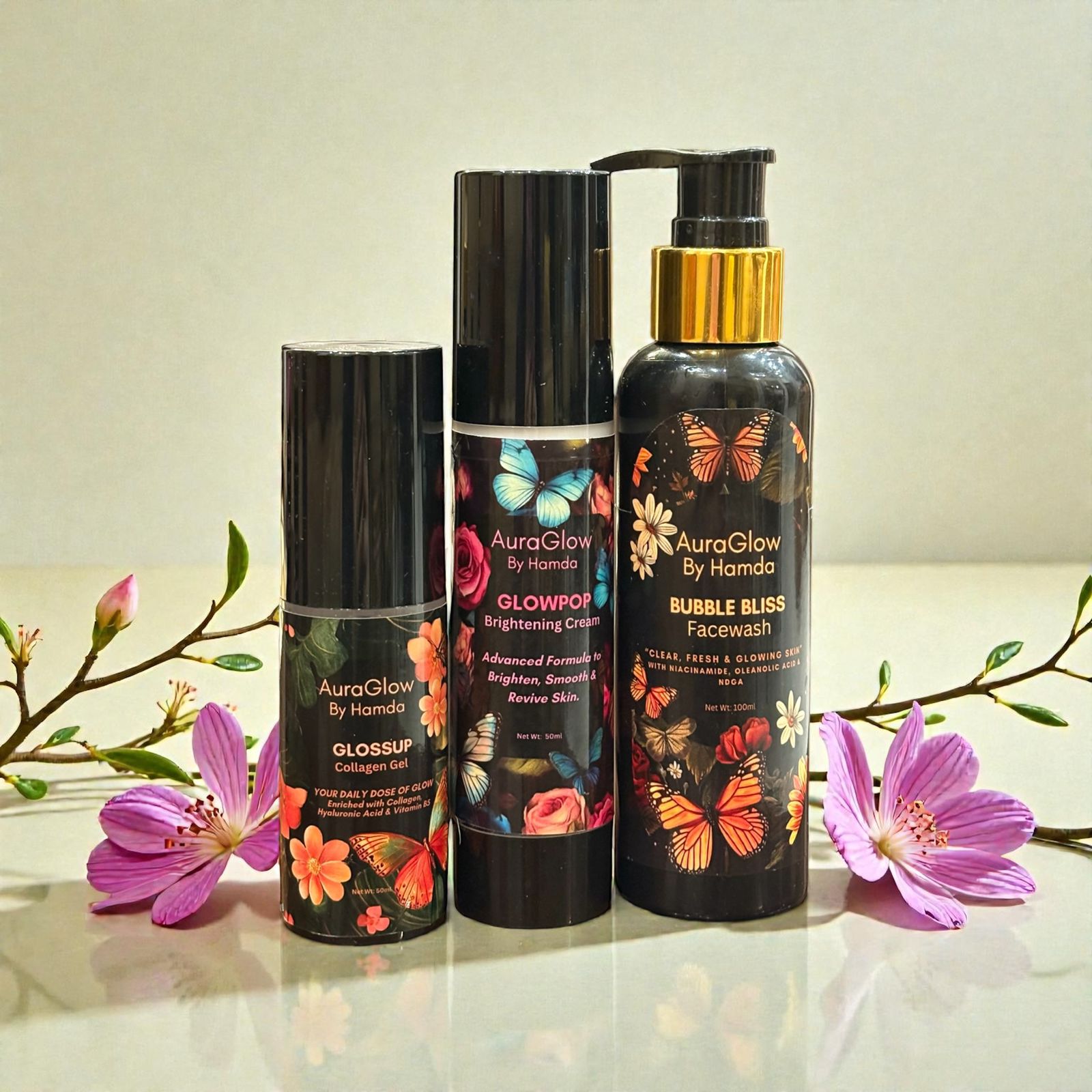 Cleanse with Bubble Bliss Facewash, hydrate and prep with GlossUp Collagen Gel, and finish with GlowPop Brightening Cream to target dark spots and uneven tone.